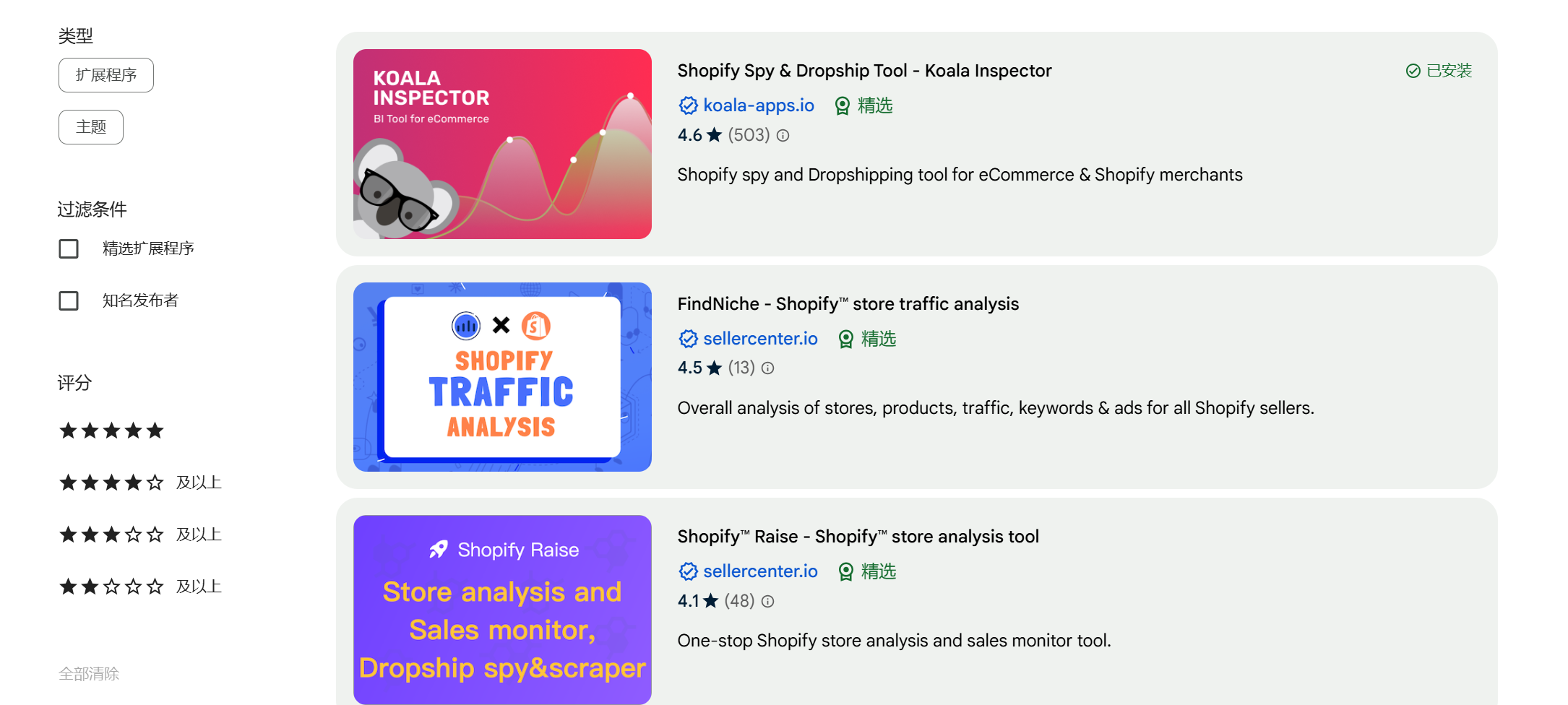 以 Chrome 浏览器为例,市面上有几款常用于检测 Shopify 网站所应用主题的插件,比如 Commerce Inspector、Koala Inspector 以及 Shopify Theme Inspector 等。