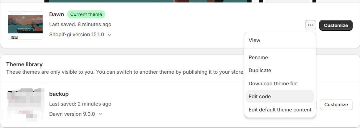 1. 点击主题的...,然后找到“Edit code”,进入主题编辑页面。
