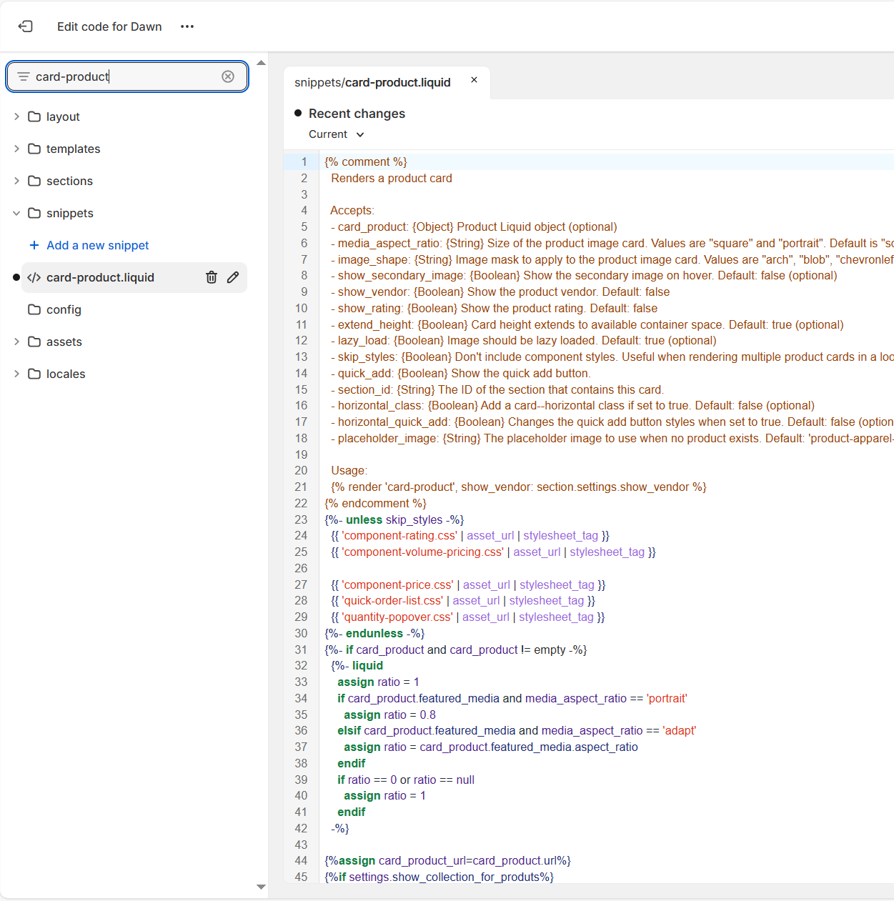 2. 搜索card - product,找到snippets -> card.product.liquid,其他主题可以试试搜索priduct - grid - item.liquid或者product - item.liquid。