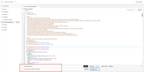 3. 点击代码区域!!!按ctrl + f,弹出搜索框,输入`card_product.url`,然后使用`crad_product.url|within:collection`,点击Replace All替换,最后别忘了按右上角的保存按钮哈。
