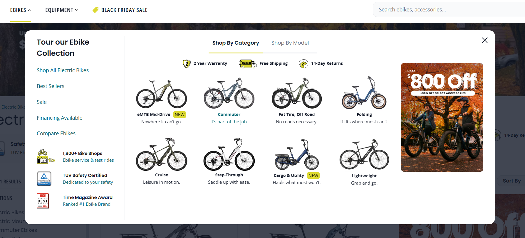 尤其是在Ebkie品牌的站点,几乎是每站必备的功能了,能将 Ebike 繁杂的品类信息进行细致分类。比如按车型可分为城市通勤车、山地越野车、折叠电动车等;按电池续航能力分为短续航、中续航、长续航等不同级别;按电机功率也有多种分类。超级菜单通过多层级结构清晰展示这些分类,使用户能快速定位到自己感兴趣的具体 Ebike 类型。